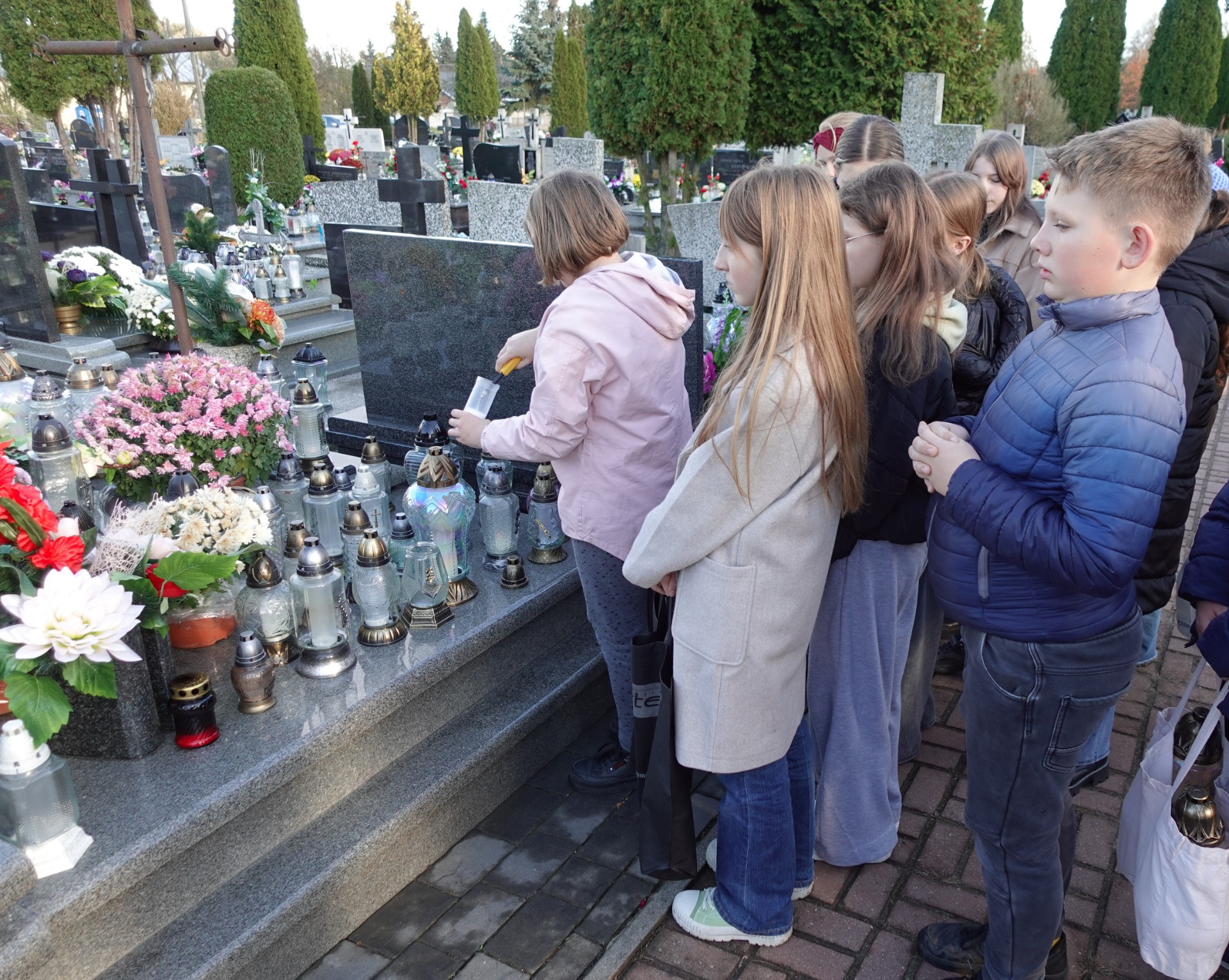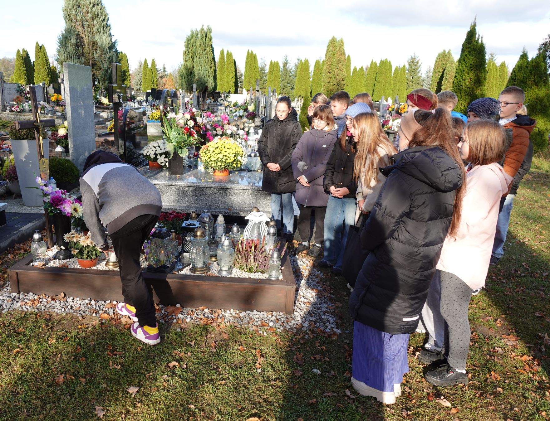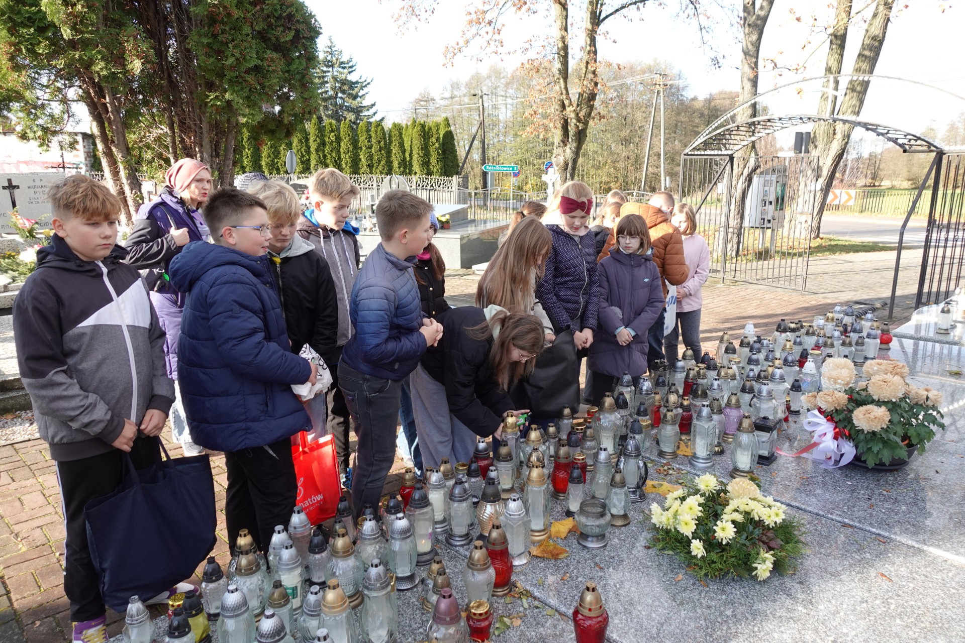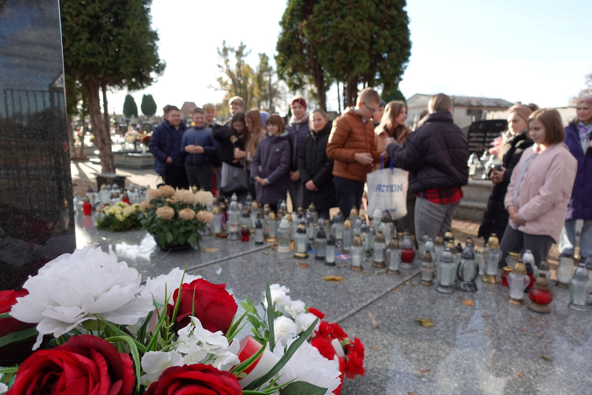 "Światełko pamięci" to akcja kultywowana w naszej placówce od kilku lat. Po Święcie Zmarłych szkolni wolontariusze udali się na cmentarz w Drużbicach, aby w imieniu społeczności szkolnej zapalić znicze na mogiłach nieżyjących nauczycieli, innych pracowników szkoły oraz poległych żołnierzy.