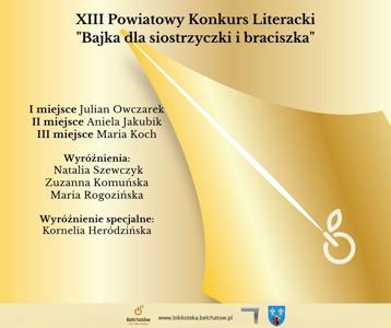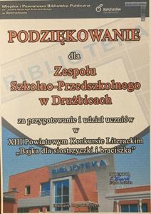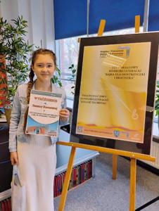 Zuzia Komuńska z klasy V, podopieczna p. Elżbiety Urban, otrzymała wyróżnienie w XIII Powiatowym Konkursie Literackim "Bajka dla siostrzyczki i braciszka" zorganizowanym przez Miejską i Powiatową Bibliotekę Publiczną w Bełchatowie.