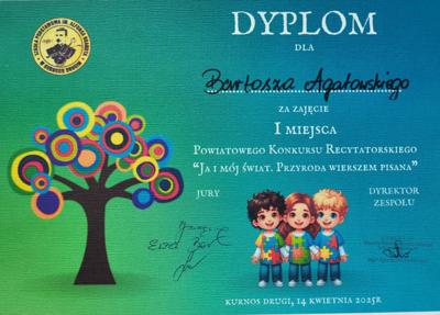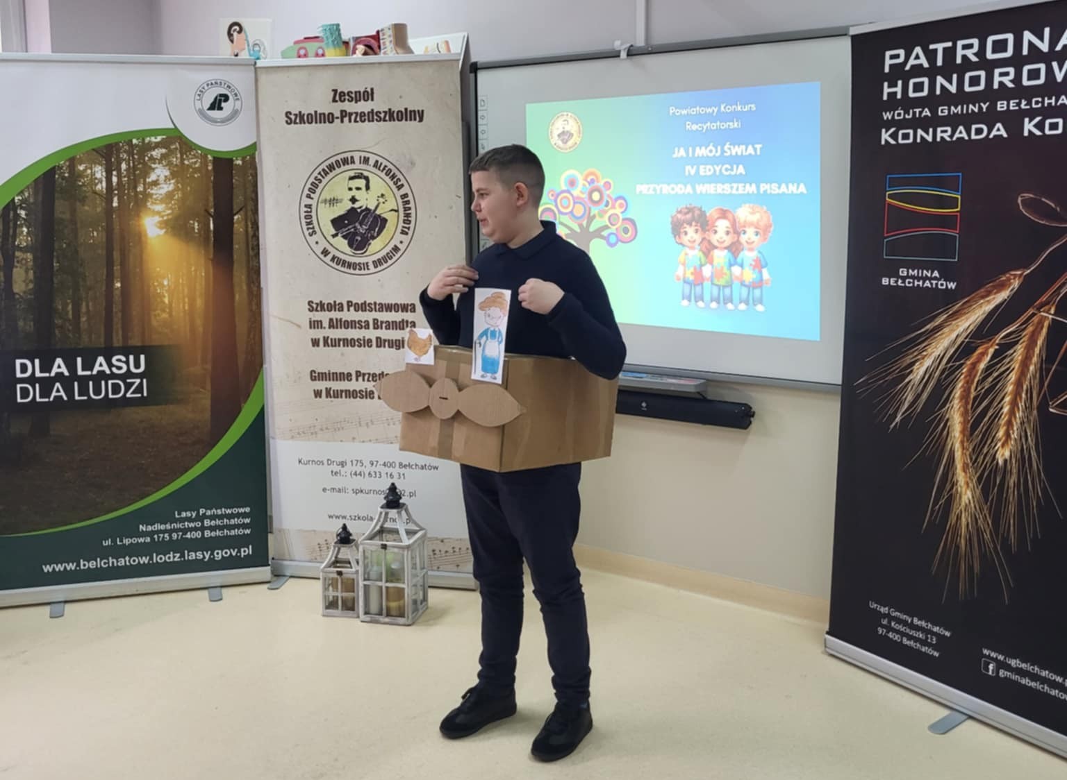 Gratulacje dla Bartosza Agatowskiego, który w tegorocznym Powiatowym Konkursie Recytatorskim ,,Ja i mój świat" zajął pierwsze miejsce w kategorii klas 4-6. Głosowa interpretacja utworu ,,W aeroplanie" Juliana Tuwima spotkała się z uznaniem komisji obradującej w Zespole Szkolno-Przedszkolnym w Kurnosie II.