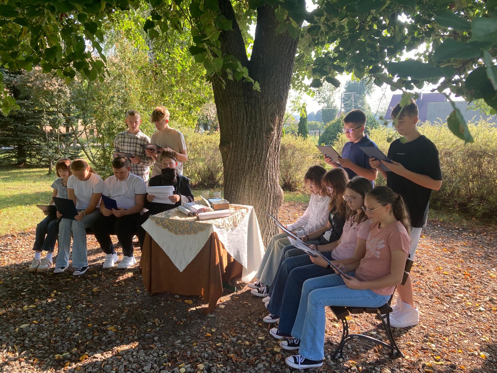 6 września 2025 r. odbyła się 14. ogólnopolska akcja "Narodowego Czytania", podczas której czytano utwory ojca polskiej poezji - Jana Kochanowskiego. W związku z tym wydarzeniem uczniowie klasy siódmej, którzy właśnie poznają twórczość mistrza z Czarnolasu, spotkali się pod rozłożystą lipą rosnacą na szkolnym dziedzińcu, by wspólnie czytać fraszki renesansowego poety. Uczniowie klas IV-VI poznawali mistrza i jego twórczość podczas zajęć języka polskiego, mierząc się z różnymi zadaniami poświęconymi wielkiemu poecie.