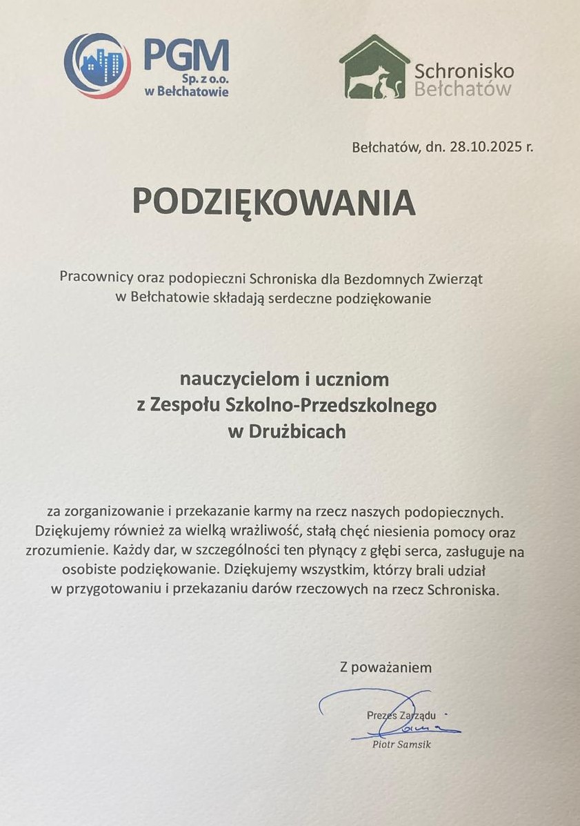 Uczniowie klas I-III przeprowadzili zbiórkę karmy dla zwierząt ze schroniska w Bełchatowie. Akcja ta była okazją do rozwijania postaw empatii, odpowiedzialności i wrażliwości na potrzeby "braci mniejszych".
