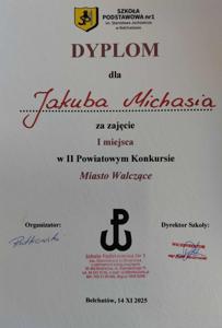 14 listopada w Szkole Podstawowej nr 1 im. Stanisława Jachowicza w Bełchatowie odbył się II Powiatowy Konkurs Historyczny „Miasto walczące”. Naszą szkołę reprezentowali Kajetan Sulski oraz Jakub Michaś z klasy VIII, przygotowywani przez panią Monikę Stachurską. Uczestnicy konkursu mieli za zadanie rozwiązać test składający się z 40 pytań zamkniętych dotyczących przebiegu Powstania Warszawskiego. Nasi uczniowie wykazali się dużą wiedzą, a szczególny sukces odniósł Jakub Michaś, który zdobył pierwsze miejsce w powiecie. Zakres wiedzy o Powstaniu Warszawskim, wymagany od uczestników konkursu, znacząco przekraczał treści przewidziane w podstawie programowej z historii.