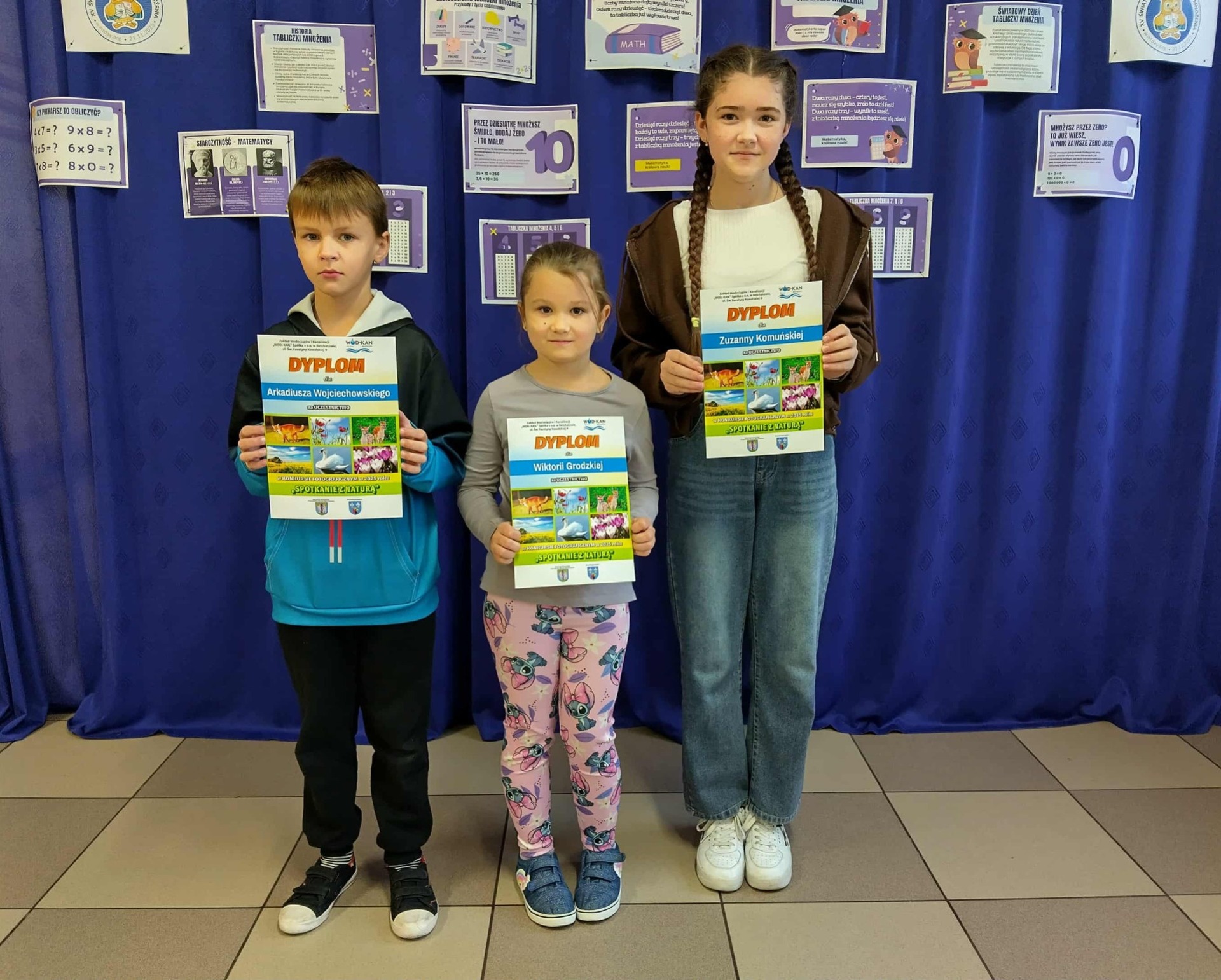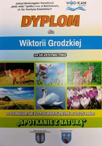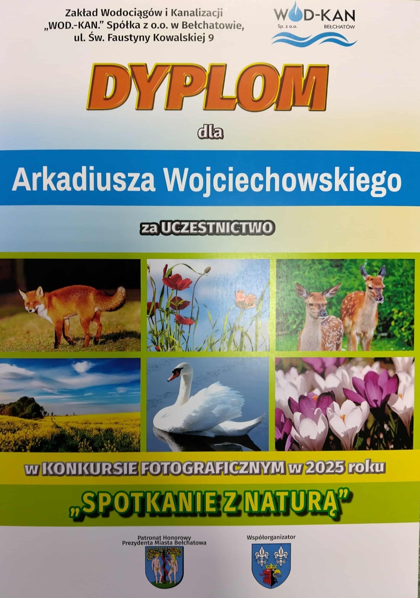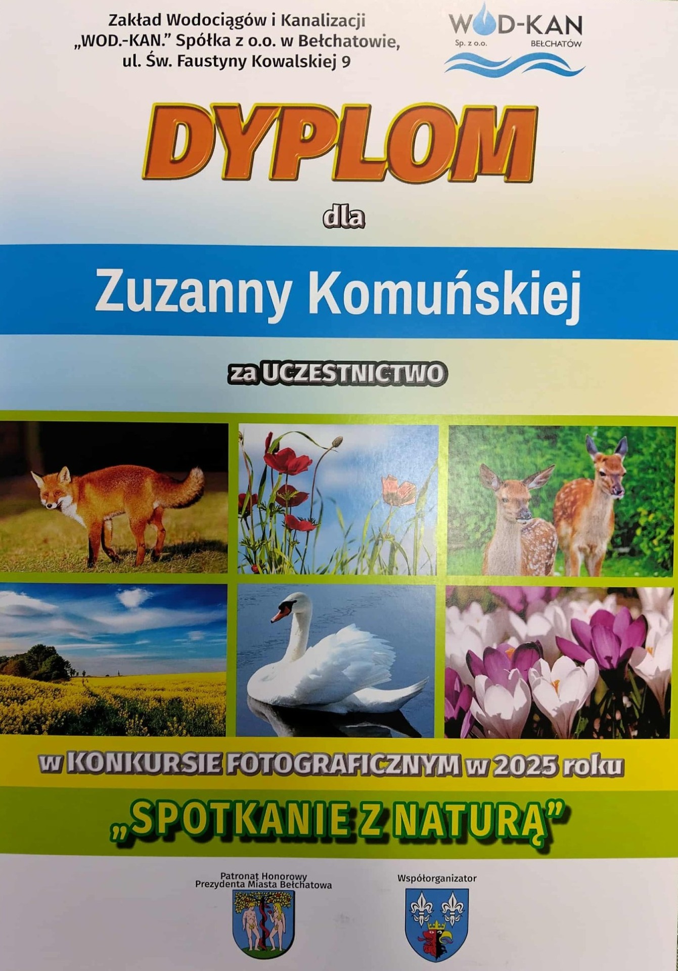 Uczniowie naszej szkoły: Wiktoria Grodzka z klasy 2, Zuzanna Komuńska z klasy 6 i Arkadiusz Wojciechowski z klasy 4 wzięli udział w konkursie fotograficznym „Spotkanie z naturą”, którego organizatorem był Wod-Kan w Bełchatowie. Zadaniem uczestników było ukazanie piękna najbliższej przyrody – jej barw, kształtów i niepowtarzalnych chwil, które często umykają naszej uwadze.